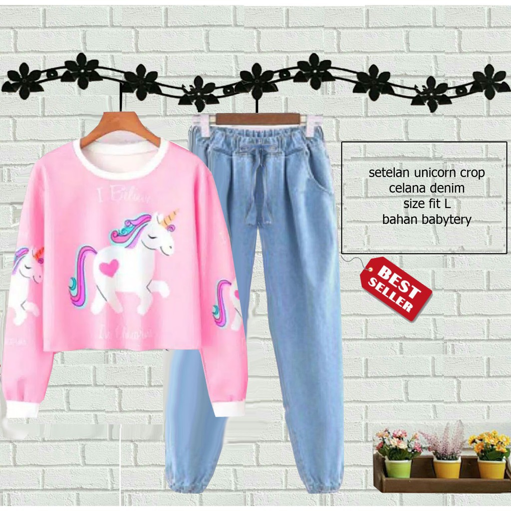 Tanah Abang Tanah Abang Setelan Unicorn Crop Celana Denim Baju Wanita Cod Shopee Indonesia